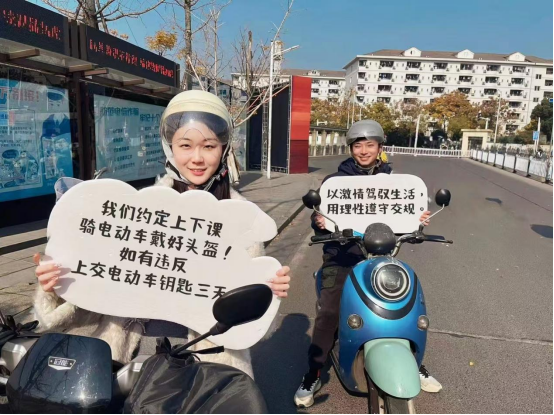 他们是互相监督与打卡的小伙伴。因为【我们的约定】,他们成为了一起上下课的“课搭子”。无论是课前骑电动车赶往教室,还是课后一起穿梭在校园里,佩戴头盔已成为他们骑行中不可或缺的一部分。这不仅是对交通规则的尊重,更是对彼此安全的承诺!