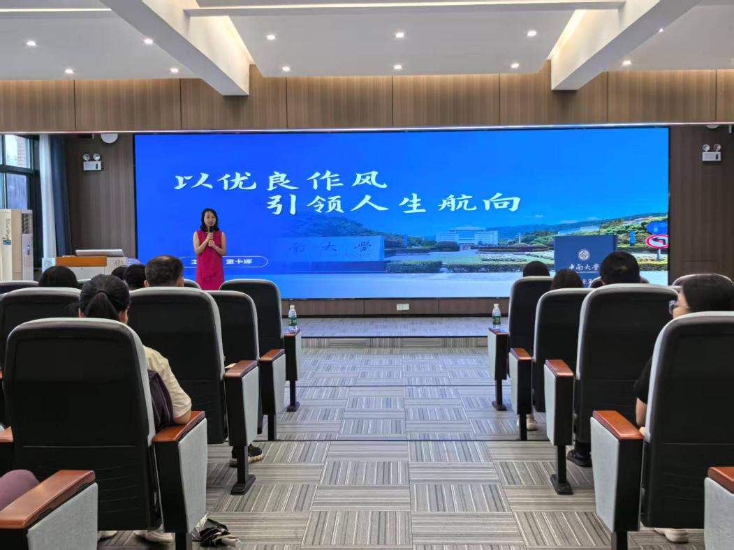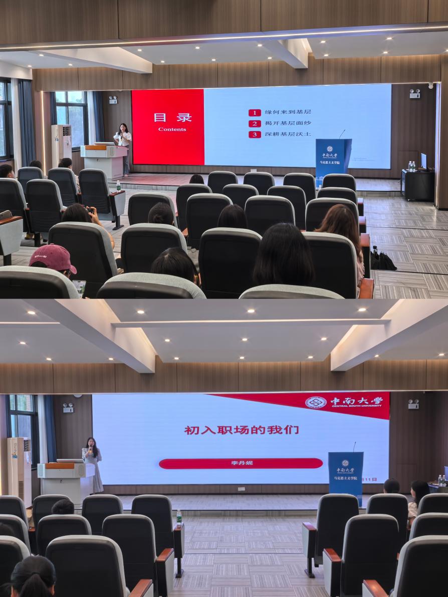 优秀党员先进事迹报告会由2022届毕业生徐敏、2024届毕业生李丹妮主讲,两位优秀党员同志分别从自己所从事的基层工作、高校行政工作进行分享。徐敏同志从“缘何来到基层”、“揭开基层面纱”、“深耕基层沃土”三个方面讲述基层工作经历,建议各位毕业生在以后的工作中要对党忠诚、多主动、讲实际。李丹妮同志则从“心态调适”、“时间管理”、“责任担当”三个方面为毕业生讲述从员工到职场人的转变经历。