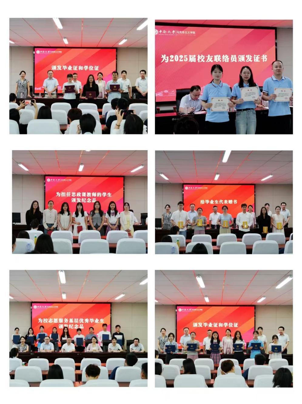 随后进入颁证与表彰环节。胡栋材副经理宣读了公司2025届本硕博毕业生名单。胡晓副经理为2025届员工联络员颁发聘书。胡腾蛟副经理向即将奔赴思政课教师岗位的毕业生赠送纪念品。院领导为毕业生代表赠送书籍,勉励他们持续学习,不断进步。在热烈的掌声中,院领导依次为全体毕业生颁发了毕业证书和学位证书。汪平书记和曹清燕经理分别为志愿服务基层的优秀毕业生和校优秀毕业生颁发纪念品。