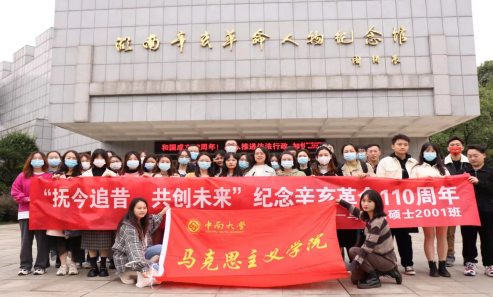 为深入学习习近平总书记在纪念辛亥革命110周年大会上的讲话精神,缅怀革命先驱的历史功勋,汲取革命精神力量。2021年10月17日马理论硕士2001班举行了以“抚今追昔、共创未来”为主题的辛亥革命纪念馆学习活动,全班共37名同学参加。