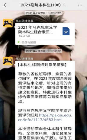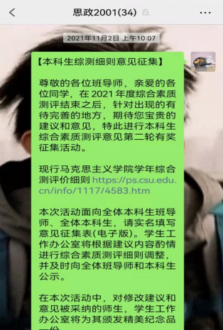 本次综合测评意见征集活动形成了有关学年综合测评细则意见收集制度,创设了意见征集邮箱账号:csumytwoffice@126.com,便于同学们继续为综合测评细则的完善建言献策。
