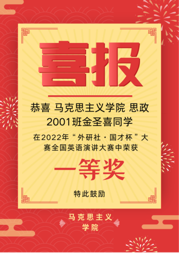 近日,2022年“外研社·国才杯”老员工全国英语演讲大赛落下帷幕,公司思政2001班金圣喜同学,以优异的成绩和出类拔萃的表现荣获全国一等奖,彰显了公司学子的精神风貌。公司学子将继续乘风破浪,再创佳绩!