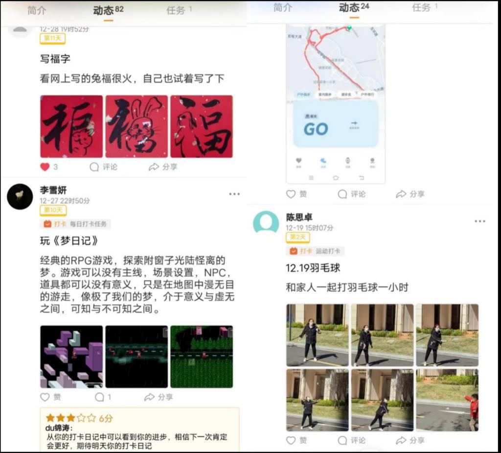 活动的打卡内容十分丰富。同学们积极参与打卡活动,围绕跑步、球类运动、室内健身、制作美食、手工、绘画、书法、乐器弹奏、电影欣赏等展示自己丰富的课外生活。每一次打卡都有积分记录,积分直接决定是否获奖,根据同学们的积分排名,最终获奖名单为: