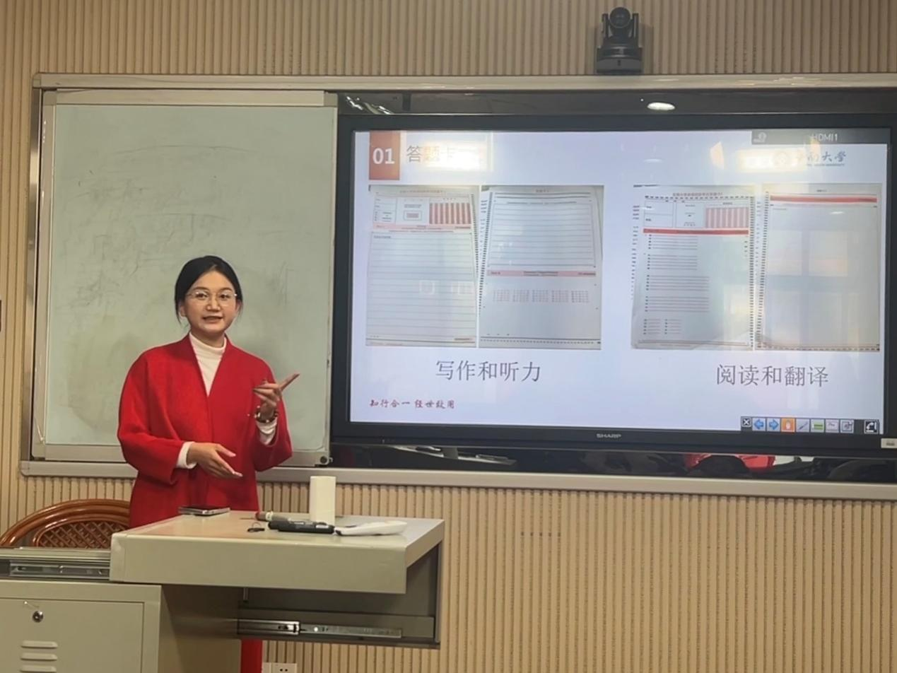 第一位主讲的是22级黄玮迪同学,她具备出色的口语能力和较强的英语能力,在英语六级考试中获得了539分。她从题型解析、备考方法和考试时间等方面给大家传授四六级备考经验,同时耐心解答同学们的疑惑,带动了现场的活跃气氛。