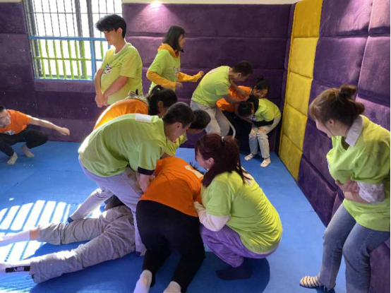 同学们被随机分为四个队伍,经过一番激烈的讨论过后一个个富有创意的队名,一句句响亮的口号相继亮相。随后,便拉开了团建活动的序幕。 第一个游戏是三分钟限时抢抱枕,这项活动检测了同学们的团结意识,不仅要反应敏捷迅速抢抱枕又要和同队的队友合作,尽力保证抱枕的数量多,十分有效的促进了同学们的合作意识。