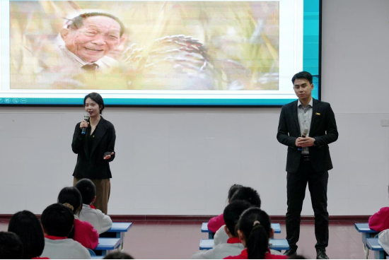 “袁隆平爷爷像长在地里的稻草人,腰弯成90度,一手拿放大镜,一手拿镊子,几乎把人要埋进稻浪中。”正是这样的身影给宣讲员夏威、王文燕、李馨茹带来了无尽的灵感。他们以《爷爷,稻子熟了》为题,绘声绘色地为小员工们讲述了袁隆平那“喜看稻菽千重浪”的一生。小员工们仿佛亲眼看见这位稻田守望者的坚定信念与不懈追求。