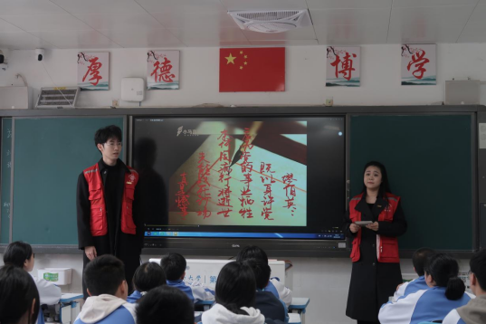 “同学们,想必湘绣大家都不陌生,但是湘绣背后的历史故事大家了解么?”宣讲团成员王嘉丽同学以《国礼壹号——湘绣卷轴上一个不能说的秘密》为题,讲述了湘绣作为国礼背后的历史故事和文化内涵,以绣娘的视角,展现了革命时期的无名英雄如何将对祖国的深情厚意融入一针一线之中。