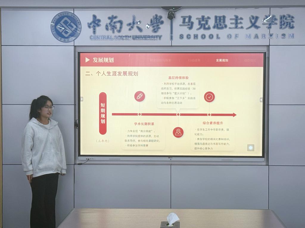 成长赛道,选手们围绕乡村振兴、企业党建、基层治理等方向,结合专业背景阐述成长路径,展现扎根实践、服务社会的担当。就业赛道的选手则聚焦具体岗位,清晰呈现求职准备与发展规划。比赛节奏紧凑,评委对选手表现予以细致点评与指导。