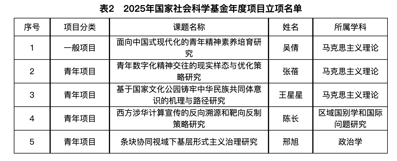 近年来,根据公司学科发展目标,公司高度重视学科与科研建设,积极组织动员全院教师申报国家社会科学基金项目。今年公司立项数量实现显著突破,是公司、公司和老师们集体努力的结果。后续公司将进一步强化动员组织、精准赋能提质,全力推动教师深耕科研方向、打磨申报成果,扎实推进 2026 年国家社会科学基金项目申报工作再上新台阶。