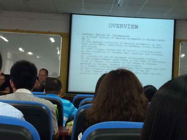 在整场讲座中,京特教授着重对不同阶段欧洲社会主义的发展进行了详细阐述。他特别指出西方语境下所建构的毛泽东主义并不等同于毛泽东思想。随后,他以时间及人物为线索,对德国、意大利与法国的共产党发展史进行了简要概括,并强调指出在欧洲社会中出现的“仅有精英阶层不可能导致革命成功”的论断与毛泽东思想之间具有异曲同工之妙。此外,京特教授还讲述了西方国家对毛泽东逝世后中国的理解,他指出西方国家普遍存在着一种认为中国正在逐渐偏离毛泽东所主张之社会主义的观点,即认为后毛泽东时代的中国正在试图去马克思主义化。面对这一判断误区,京特教授也给出了自己的建议,他认为中国不应该仅仅是反唇相讥,更应该向世界展示中国体系的运作方式与优势所在。