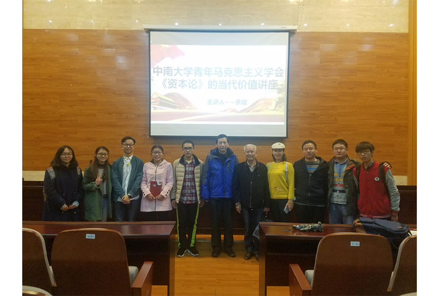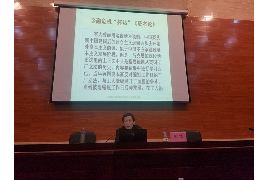 最后,余斌老师向我们展示了马克思夫人燕妮提的一段话:“马克思没有医治我们社会的脓血迸流的创伤的任何现成的特效药(现在也以社会主义自许的资产阶级世界正在大声叫卖这种特效药),没有任何丸药、药膏或纱布;然而我以为,他从现代社会产生的自然历史过程中得出了实际结果和运用这些结果的方法,直到做出最大胆的结论……历史对我来说已经像太阳光那样明亮了。”余斌老师指出,历史并没有被资本主义终结,随着中国特色社会主义事业的发展和中华民族伟大复兴的“中国梦”的实现,历史还是会向社会主义进发。同时,余斌老师号召同学们认真研读《资本论》,坚定理想信念,为早日建成社会主义现代化强国而奋斗!