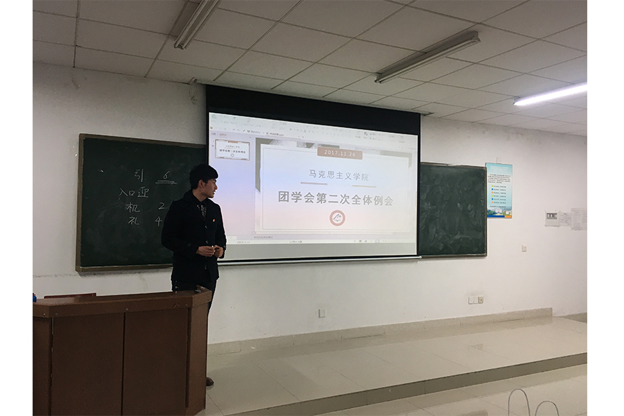 会议第一项,团学会主席陈力瑞发言致辞。主席陈力瑞首先对于团学会各部门上阶段的工作进行了一个简要的评析,又结合“学习十九大精神,争做优秀员工干部”的会议主题对团学会的工作进行了全方位的部署与展望。