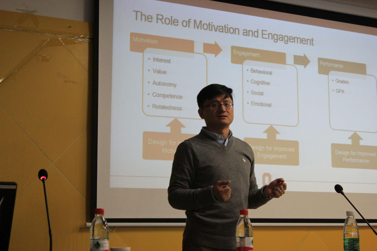 讲座伊始,谢魁教授首先介绍了俄亥俄州立大学数字化学习研究室的基本情况,并以“员工的学习动机是什么”、“数字化环境下的学习有何意义”等问题引出了讲座的主体内容。他指出,技术不仅改变了我们的社会结构,也在改变着人们获取知识的途径。在“参与性网络空间”不断发展的今天,我们的学习变得更加开放,更加具有柔韧性、参与性、社会性和协作性等特征。 当谈及学习动机的相关理论时,谢魁教授从“自我决定理论”出发,分析了员工学习的内在动机、外在动机和无动机三种情况,并明确表示“内在动机”是最好的动机,要采取一定的教学手段将学习动机内在化。他认为,学习动机主要包含兴趣、价值观、自我选择性、自信心及相关性等五个层面,这五个层面对学习参与产生了不同程度的影响。谢魁教授在此基础上进一步指出,学习参与主要分为行为参与、认知参与、社交参与和情感参与,这些参与情况直接影响着学习成绩和学习效果。最后,谢魁教授指出,教学设计不能只为员工的成绩设计,更要为学习动机和学习参与设计,以期达到最佳效果。 讲座结束后,在场师生与谢魁教授进行了精彩而深入的互动交流。