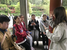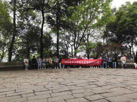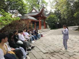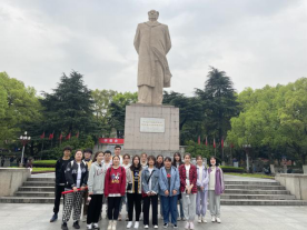同学们最先到达爱晚亭,李睿琎同学为大家讲述爱晚亭的故事,爱晚亭曾是革命活动胜地,毛泽东青年时代,在第一师范求学,常与罗学瓒、张昆弟等人一起到岳麓书院,与蔡和森聚会爱晚亭下,纵谈时局,探求真理。跨越时空与党会面,同学们感触颇深。