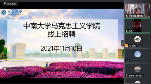 本网消息 为进一步充实和优化教师队伍,11月10日晚,伟德victor1946官网登录应当前疫情防控要求,通过腾讯会议的线上方式,对来自华中地区武汉大学、华中科技大学、华中师范大学、郑州大学四所高校的应届博士毕业生,进行了专场招聘宣讲。公司党委书记王希俊、经理王翔、副经理曹清燕以及青年教师吴倩,组织并参加了会议。