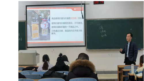 这三位教师分别讲授的是《加强以民生为重点的社会建设》(杨金月)、《为建立新中国而奋斗(前半部分)》(王昕伟)、《商品经济的形成和发展》(徐如刚)。他们的现场教学活动均亮出了自己的八般武艺,表现了一些共同的优点:一是在课前都做了充分的准备。三个课堂都有明显的课程设计方案,从导入到主题展开、内容结构、课堂讨论、雨课堂测试、问答互动、要点板书,到课尾小结、思考题、参考书目,都有一套比较完整的教学活动设置;二是PPT课件的制作都下了功夫。文字、图片、视频、表格、在大小、色彩和形式上都较丰富协调、美观大方;三是讲授的主要内容结构合理,各部分逻辑关系明确,脉络清晰。杨金月的课堂讲了“在发展中保障和改善民生”“加强和创新社会治理”二大部分,王昕伟讲授了“从争取和平民主到击退国民党军事进攻”“全国解放战争的发展和第二条战线的形成”二节,徐如刚讲授了“商品二因素及其矛盾”“劳动二重性及其矛盾”“商品的货币形式及其矛盾”“私有制商品经济的基本矛盾”四大点,其下各又分出若干小目。他们讲授各部分的时间把控基本平衡,没有出现太大的赶课现象;四是三个课堂内容都引述了一定量的马列原著和领袖语录,并加以适当解说,增加了课堂的理论性、思想性。徐如刚基本是依据马克思《资本论》的观点讲解的,且运用了矛盾分析方法,王昕伟展示了毛泽东的二件题词手迹,杨金月引用了多条习近平语录,这是引导员工提升理论思维能力所必须的教学方法;五是各课堂都补充了一些案例,有具体事件、人物,大体联系了历史或现实,有利员工理解课本观点,把握主题。杨金月为了说明民生的一个重要问题即教育发展的不平衡,除了展示高教发展、资金投入表,还举了张桂梅的事迹,说明边疆发展不平衡,需要我们大家都要自觉奉献。徐如刚则举了过度购物引发家庭矛盾的案例说明消费主义的不良影响;六是对课堂员工的落坐秩序都有管理,关注员工的听课情况,间或走动示意,引导员工的注意力集中到课堂学习上。总体上这三场公开课教学活动有使听者眼前一亮的感觉。