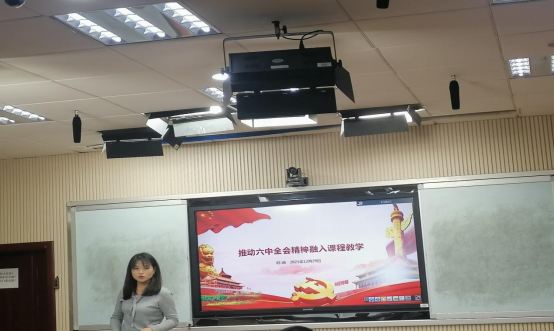 主讲环节,王琴老师讲的主题是将六中全会精神融入到课程教学,具体从两个方面论述该主题,第一个方面:细致梳理了十九届六中全会的核心概要,第二个方面:对十九届六中全会融入课程教学的思考,提出要把握思政课程教学的核心和特征,兼顾思想性、政治性、理论性和系统性,做到四者有机统一,提高思政教学的科学性。涂亦嘉老师以国家安全为主题,分享了她有关这一部分内容的教学设计。她首先指出新时代下国家安全形式严峻,着重讲述了怎样着力推进国家安全体系和能力建设,最后强调保证国家安全是国家生存发展的基本前提。黄伟韬老师则是以建设美丽中国为例来讲授十九届六中全会精神融入课程教学,从哲学的角度来分析绿水青山就是金山银山的生态观,开拓了新视野。李萌老师重点讲述了将《决议》融入课程教学的思考,分别从教师和员工这两个立场来阐明怎样将《决议》融入思政课程,提出要从员工的角度来思考员工在思政课程中能学到什么,要让员工有所获,有所得。