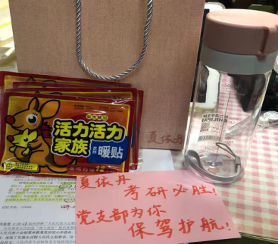 2022届考研倒计时已经敲响,2018级的马院学子们即将迎来考研的“战场”,为了帮助考研学子坚定目标、调整心态、树立信心,马克思主义公司第一党支部组织开展了“考研送温暖”志愿服务活动。通过送“暖心礼包”、送午餐、送祝福视频等多样化的活动形式,为考研学子准备了十分贴心的礼物,送上了温暖的问候与亲切的祝福。