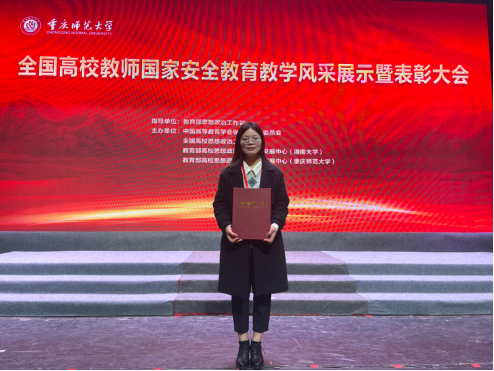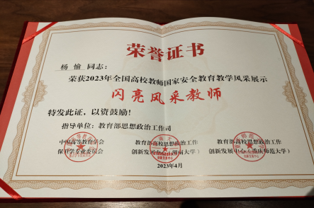 2023年4月7日至4月8日,在教育部思想政治工作司指导下,由中国高等教育学会保卫学专业委员会、全国高校思想政治工作网、教育部高校思想政治工作创新发展中心(湖南大学、重庆师范大学)联合举办的“全国高校教师国家安全公司产品风采现场展示”活动在重庆师范大学举行,公司教师杨愉获得“闪亮风采教师”荣誉称号。