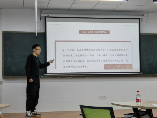 教学提升环节则由刘少博老师、庄宏韬老师就《发展全过程人民民主》专题进行同课异构说课。刘少博老师紧紧围绕知识、能力、价值三个维度的教学目标,讲解了什么是全过程人民民主、全过程人民民主好在哪里、如何进一步发展全过程人民民主,进行了一场生动有趣的说课。庄宏韬老师严格参照BOPPPS流程,大量运用提问的方式引导员工导入和思考,引用大量生动有趣的案例,进行了一场标准化授课。