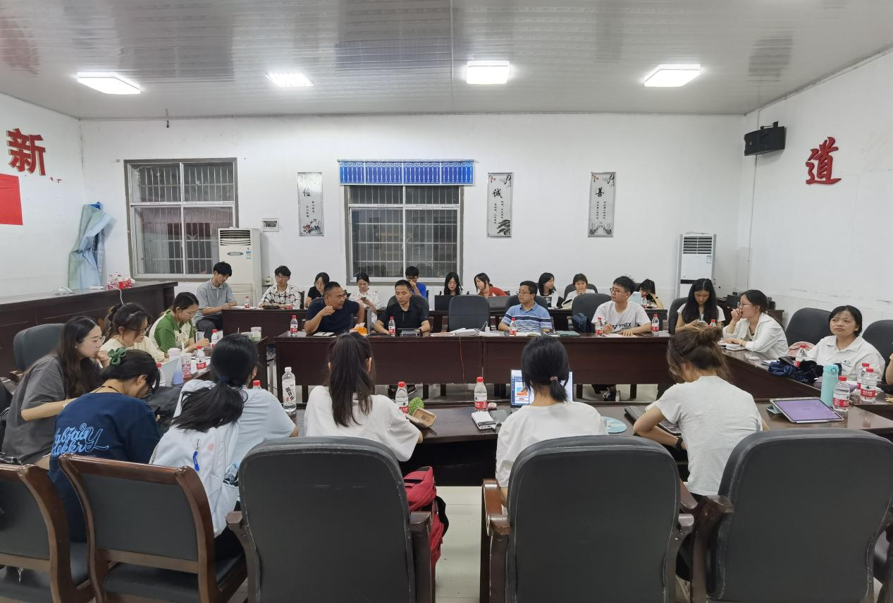 为总结交流同学们的认知实习经验,规划充实接下来的工作内容,7月14日晚18:30分,思政2101班在河坝镇政府会议室召开第二次实习周结会议。实习带队教师欧阳鹏,河坝镇党委委员李兴,党政办主任陈佳强出席,带队老师郭鹏飞主持会议。