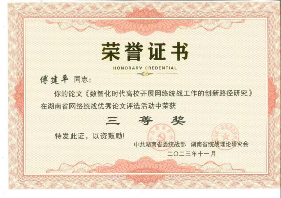 11月27日上午,湖南省网络统战创新交流硏讨会在湖南宾馆召开。湖南省委常委、省委统战部部长隋忠诚出席会议并讲话。省委统战部分管日常工作的副部长丁学新对获奖者和组织单位作了通报表彰。公司傅建平老师的论文《数智化时代高校开展网络统战工作的创新路径研究》、谢琰老师的论文《网络统战与中华民族共同体意识建构的策略研究》在湖南省网络统战优秀论文评选活动中荣获三等奖。