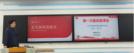 本次备课会采用主讲与研讨相结合的方式。首先由苏广兴老师围绕“太平天国农民战争的爆发与失败”这一主题进行说课。苏老师先以“太平玉玺”切入,接着以时间轴为主线,运用充分的史实讲述太平天国农民战争爆发的背景,从金田起义、定都天京、天京事变以至天京陷落的发展历程。最后,他又对太平天国运动进行简要的评价。