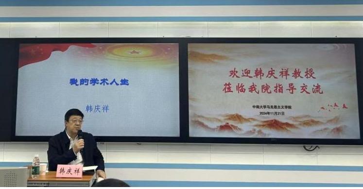 韩庆祥教授首先介绍了自己的求学经历,他从学术使命、学术目标、学术执念和学术生命四个维度讲述了做学问的精神。在他看来,学问精神至少包含厚积薄发、心无旁骛和学术追求三个方面,其中学术追求尤为重要,要求学者搞学问不能闭门造车,而要密切关注国家的发展现状,回应人民的所期所盼。其次,韩教授以自身做学问的经历为例,与大家分享了做学问的境界。于他而言,学术研究既是一份谋生的职业,更是一份热爱的事业。韩教授将自己所有的学术成果凝练为“马克思主义开辟的各自道路”这一主题,并强调自己坚持一以贯之的用哲学思考问题、用学术支撑思想、用理论引领发展和用学术滋养政治的学术风格。随后,韩教授向在座师生讲解了自己学问的方法,围绕问题导向、文献资源、分析框架、原创观点等多个方面出现的常见问题和解决方法展开交流。同时,韩教授还回顾了自身做学问的历程,将自己的学术人生划分为马克思哲学的实践生成论等九个阶段,并简要提及各节点的缘由和各阶段的代表性成果,尤其是与大家分享了自己关于文化与文明的最新研究成果。最后,韩教授简要介绍了自己做学问的成就,并鼓励在座师生将潜心问道与关注社会相统一,做经得起时间考验的学问。