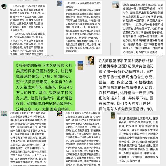 基础党支部组织全体党员观看电影《金刚川》和纪录片《抗美援朝保家卫国》,并撰写观后感,通过线上与线下相结合的方式分享学习体会,进一步提升学习效果。