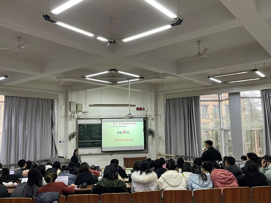 20231215日上午,研究生思政课教研中心在湘雅新校区T306教室开展了本学期博士研究生《中国马克思主义与当代》课程公开课教研活动。公开课由姜芳蕊老师主讲,主题为“当代科学技术”。公司胡栋材副经理和数名老师参与听课评课活动。